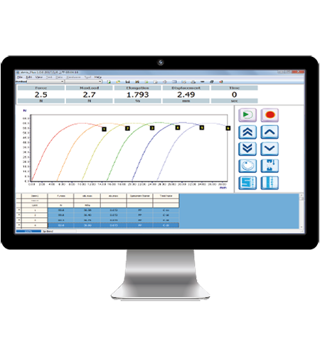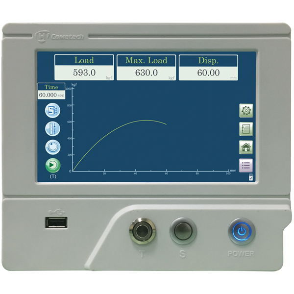 機台標配7吋彩色觸控螢幕,測試過程中可即時顯示曲線圖與相關數據,快速獲取測試結果;可另選購專用軟體進行多種包裝測試模式,例如直接破壞測試、固定壓力測試、潛變測試、自動回位等,另可設定兩段以上測試速度以縮短操作時間。